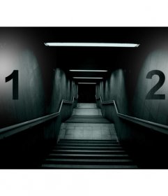 erstellen sie eine erschreckende collage mit dem bild von einem dunklen treppenhaus und zwei fotos auf jeder seite