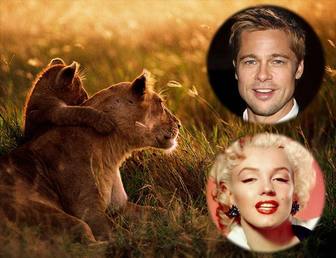 Setzen Sie Ihr Bild neben diesen zwei Löwen auf einer Wiese. Sie können zwei Bilder von dir in einem Kreis auf der rechten Seite der Mutter Löwen und ihr Junges setzen.
