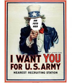 Setzen verkörpert die UNCLE SAM von Vereinigten Staaten, Ihr Gesicht in das Gesicht dieses Zeichen der Rekrutierung für die US Navy anpassen und per E-Mail oder soziale Netzwerke diesen Spaß Wirkung als Witz geschickt. Sie können das Foto, das Sie zu diesem Zweck wollen hochladen und Teil eines Plakats der Armee sein.
