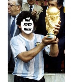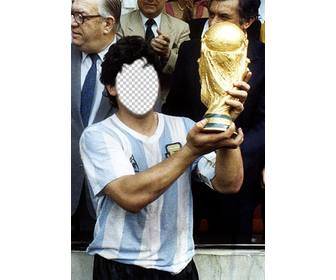 In diesem Fotomontage Heben Sie Diego Armando Maradona in seinen Händen den Becher der Welt des Fußballs halten wird, mit dem T-Shirt der Auswahl Argentinien, haben Sie nur Ihr Foto hochladen und ändern Sie Ihr Gesicht auf wenn Sie zu diesem Spieler Legende und teilen mit Ihren Freunden sind ein Fan von diesem Sport und dieses berühmte Charakter und dieser Effekt ist frei.