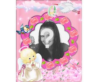 Bilderrahmen rosa Hintergrund mit Wolken und Sternen Shining On You ein Bild einfügen. Sie scheinen ein kleiner Engel mit einem Heiligenschein mit den Händen zusammen im Gebet Position