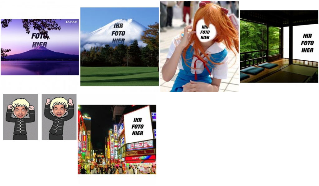Hier finden Sie alle Arten von Effekten und Dekorationen für Ihre Fotos mit diesem orientalischen Land verbunden zu finden. Es gibt Postkarten von Tokyo, der Hauptstadt des Landes, wie auch andere typische Landschaften wie der Berg Fuji. Wir haben auch die japanische Kultur bedingte Effekte: Manga oder Anime oder berühmte Menschen aus diesem Land.